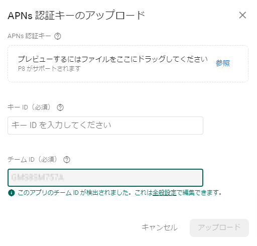 apple developer programで作ったkeyをFirebaseのCloud Messaging→Apple アプリの構成→APNs 認証キーにアップロードするのだが、ここで「ファイル」と「キー ID」と「チーム ID」を登録しなければならない。